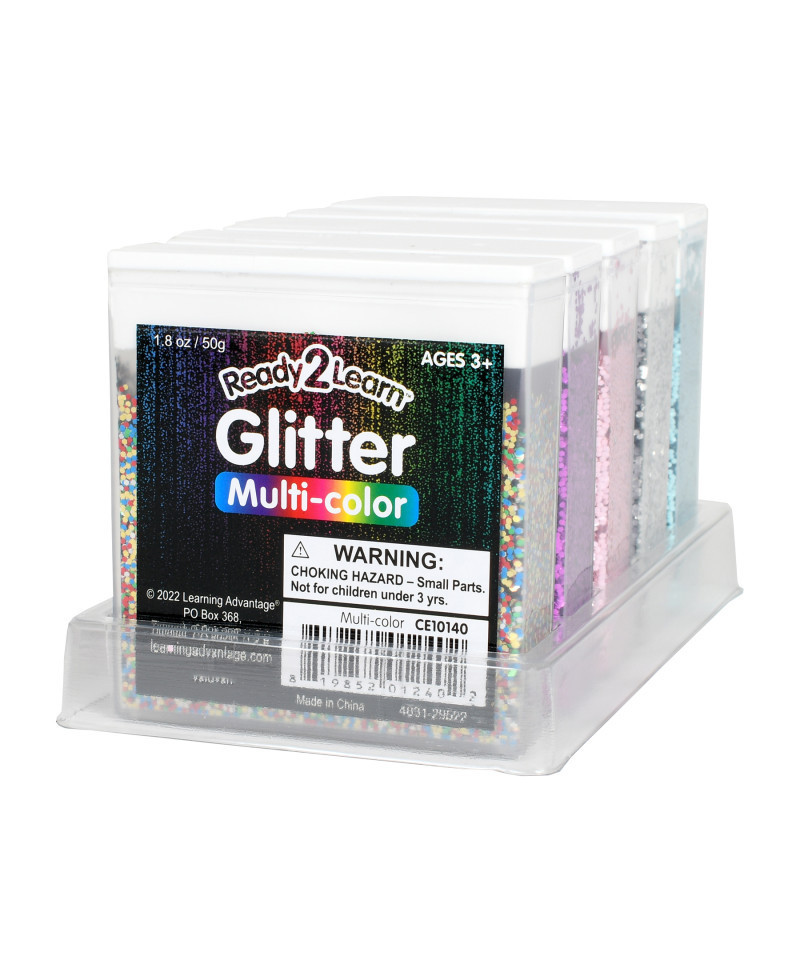 Each set includes 5 containers with 1.8 oz of pink, purple, turquoise, silver and multicolor glitter. This shiny, vibrant glitter is the prefect addition to any arts and crafts supply! Adhere glitter to 2D art projects for color and sparkle. Create layered 3D art in jars, bottles, glasses, flower vases, shadowboxes and more. Or, incorporate glitter into a variety of sensory stations and activities. Crafting with glitter contributes to the development of children's fine motor skills, hand-eye coordination and creative expression. The containers feature an easy-pour lid and plastic tray for easy cleanup, storage and travel. This glitter is non-toxic. For ages 3+. Container size: 3.2"L x 3.4"H. Sold as 2 sets for a total of 10 containers of glitter.
