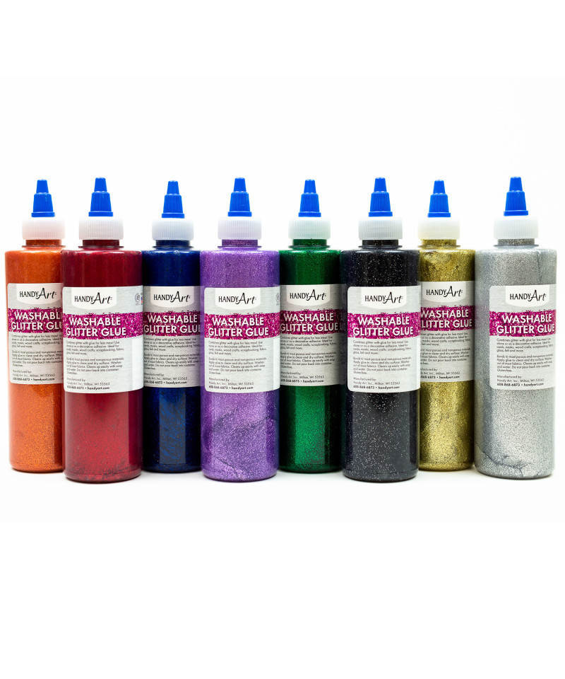 Combines glitter with glue for less mess while adding sparkle, shimmer and shine to all your art and craft projects! Use alone or as a decorative adhesive on cards, masks, wood crafts, scrapbooking, fabric, glass, felt and more. Bonds to most porous and non-porous materials. Washes out of most fabrics. Water based and Certified AP Non-Toxic. Made in the USA. Each set includes 8 bottles, 8 oz. each.