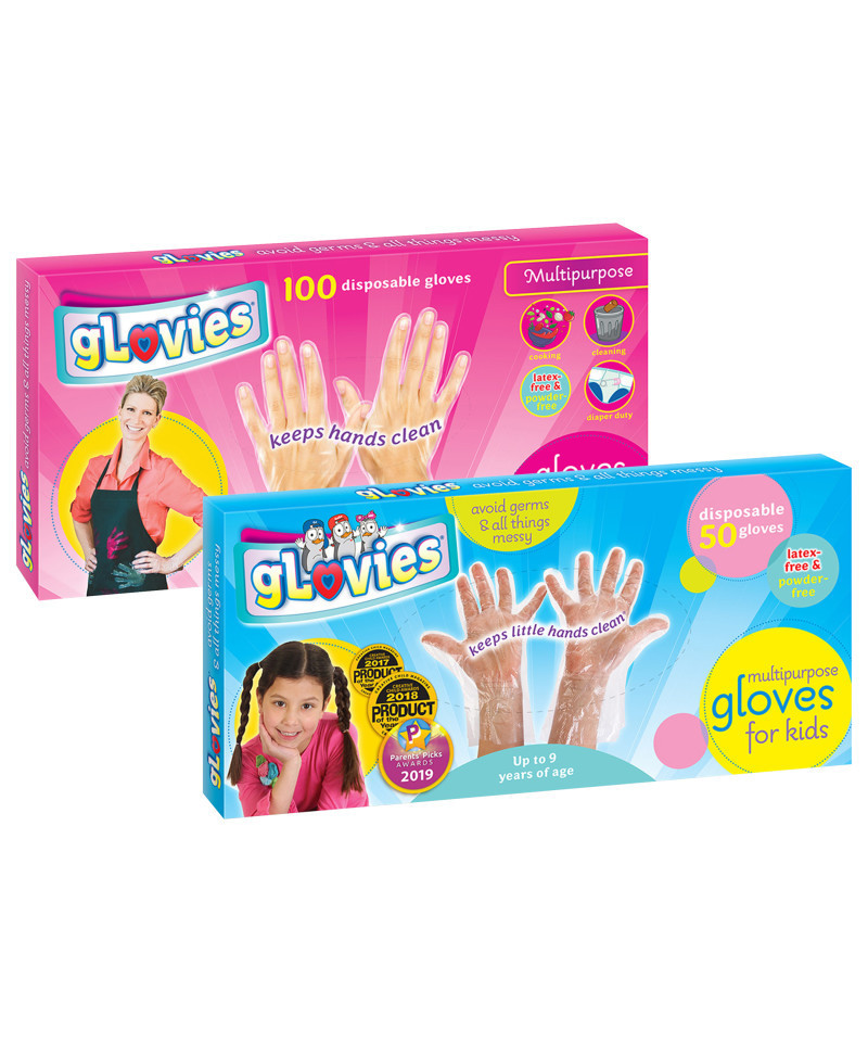 gLovies multipurpose disposable gloves for adults and kids! Keep hands clean and protected while handling food or to do other things where dexterity matters, such as messy arts and crafts projects. Latex-free & powder-free. Adult medium size gloves for moms and teachers, plus a small size for kids! gLovies avoid germs and all things messy. Keep hands clean for safety and quick cleanup. Ideal for: food prep, school, home, work, camp, museums, all things messy. Includes 2 packs of gloves: 100-pack adult size and 50 count kids size (150 total goves).