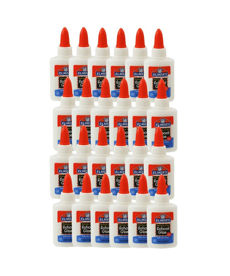 Children can easily attach items to paper, wood, cloth, pottery, and more with the non-toxic adhesive of Elmer's Washable School Glue. Specially formulated to be washable and easy for kids to use, Elmer's School Glue is perfect for school projects and home arts and crafts. This glue is adjustable before setting and does not run, delivering reliable results with every use. Elmer's Washable No-run School Glue is easy to use and stays where you put it. It is safe, non-toxic and washable, so accidental messes mean easy clean-up. Unleash your child's creative imagination as they bond things together with Elmer's Washable School Glue. Each bottle includes 1.25 oz. Sold as 24 bottles of glue.