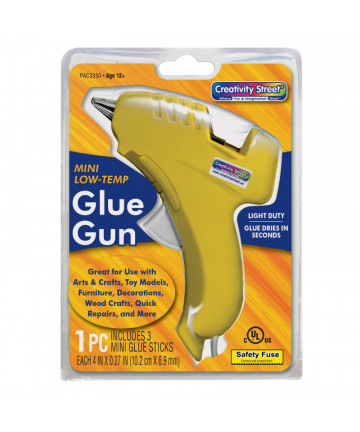 Mini-Glue Gun melts glue at 220 degrees F for safer use by young children. Uses 0.31" diameter glue sticks for quick repairs, toys and models, furniture, wood crafts and more. Plugs into any standard 120 volt electrical outlet. U.L. approved. Each glue gun comes with three glue sticks. For ages 5 and up. Sold as a pack of 2 glue guns.