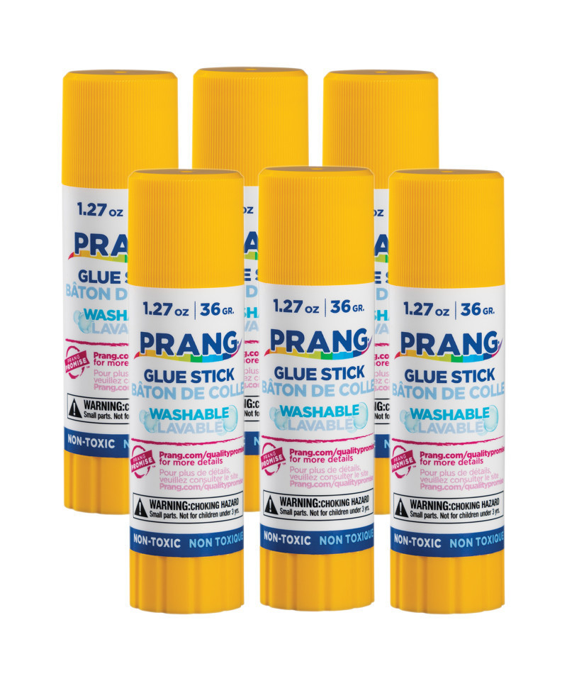 Handy twist-up applicator makes Prang the easiest way to glue. Perfect for use on paper, photos and fabrics. Dries wrinkle free. Washable, odorless, non-toxic formula is great for children. 1.27 oz. sticks, clear. AP Certified non-toxic. Sold as a pack of 6.