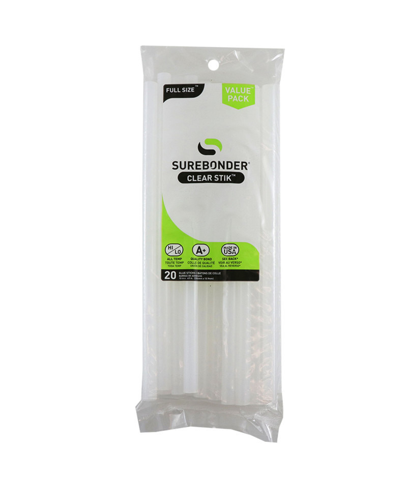 Surebonder All Temperature Glue Sticks works at either low temperature (230 degrees F) or high temperature (380 degrees F) for everyday gluing projects. Use with hot or low temperature glue guns. Bonds to metal, wood, paper, fabric, magnets, ceramics, floral arrangements, glass and plastic using a high temperature glue gun. Bonds to delicate materials such as balloons, ribbon, lace and children's crafts using a low temperature glue gun. Clear color with 60-65 second working time. 7/16 -inch diameter by 10-inch length. 20 sticks per bag.