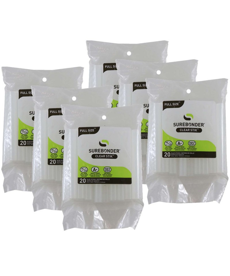 Surebonder DT-20 All Temperature Glue Sticks is an all-temperature hot melt adhesive that works at either low temperature (230 degrees F) or high temperature (380 degrees F) for everyday gluing projects. Use with high or low temperature glue guns. Bonds to metal, wood, paper, fabric, magnets, ceramics, floral arrangements, glass and plastic using a high temperature glue gun. Bonds to delicate materials such as balloons, ribbon, lace and children's crafts using a low temperature glue gun. Clear color with 60-65 second working time. 7/16" diameter x 4" length. 20 sticks per pack. Sold as 6 packs for a total of 120 glue sticks.
