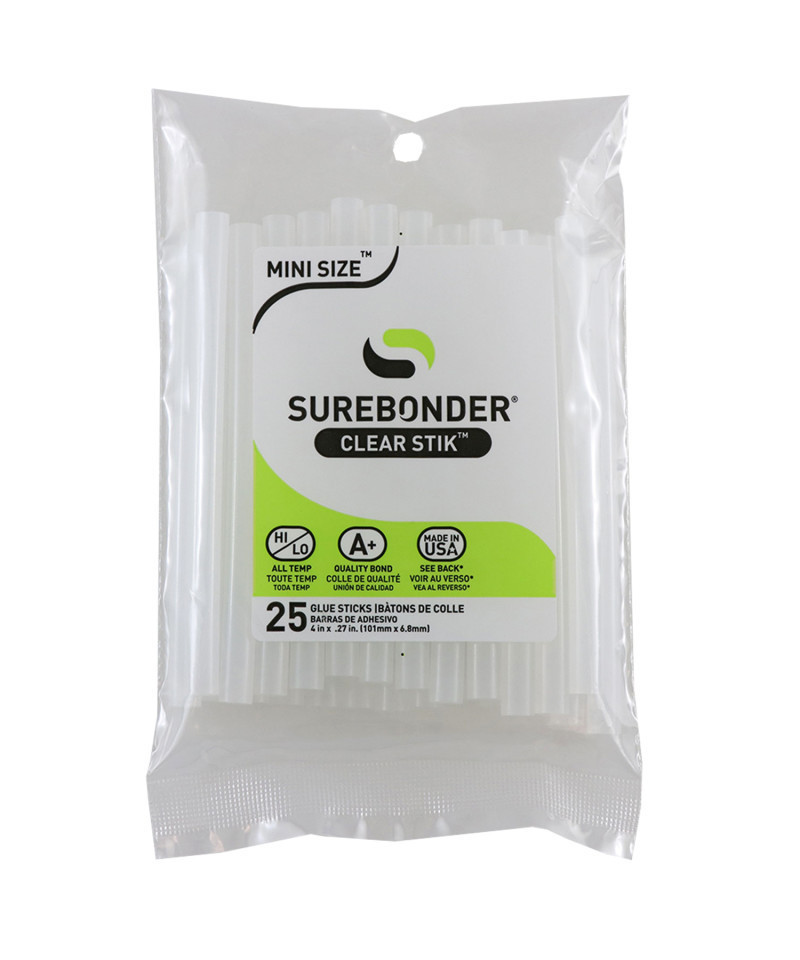 Surebonder DT-25 All Temperature Mini Glue Sticks is an all-temperature hot melt adhesive that works at either low temperature (230 degrees F) or high temperature (380 degrees F) for everyday gluing projects. Use with high or low temperature glue guns. Bonds to metal, wood, paper, fabric, magnets, ceramics, floral arrangements, glass and plastic using a high temperature glue gun. Bonds to delicate materials such as balloons, ribbon, lace and children's crafts using a low temperature glue gun. Clear color with 60-65 second working time. 5/16 -Inch diameter by 4-Inch length. 25 sticks per bag.