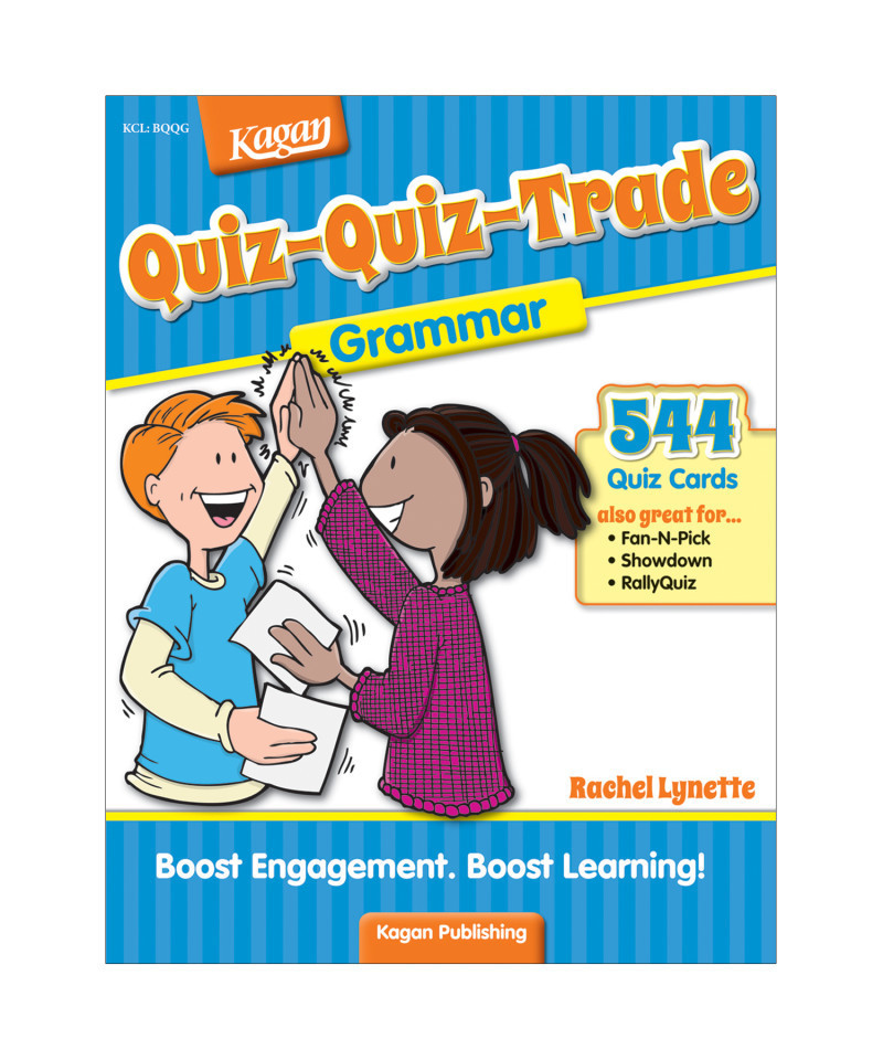 Quiz-Quiz-Trade is a student favorite! This Kagan Structure turns need-to-know curriculum into a fun and interactive quizzing game. To play, every student receives a quiz card relating to the topic. Students then pair up with a classmate. Using their cards, they quiz each other. After coaching or praising, they trade cards and set off to quiz a new classmate with their new card. The repeated practice boosts retention of the content. Memorizing important information and concepts has never been so fun! Each book is loaded with card sets on a variety of topics. Each card set includes enough ready-to-copy cards for your entire class to play. 216 pages.