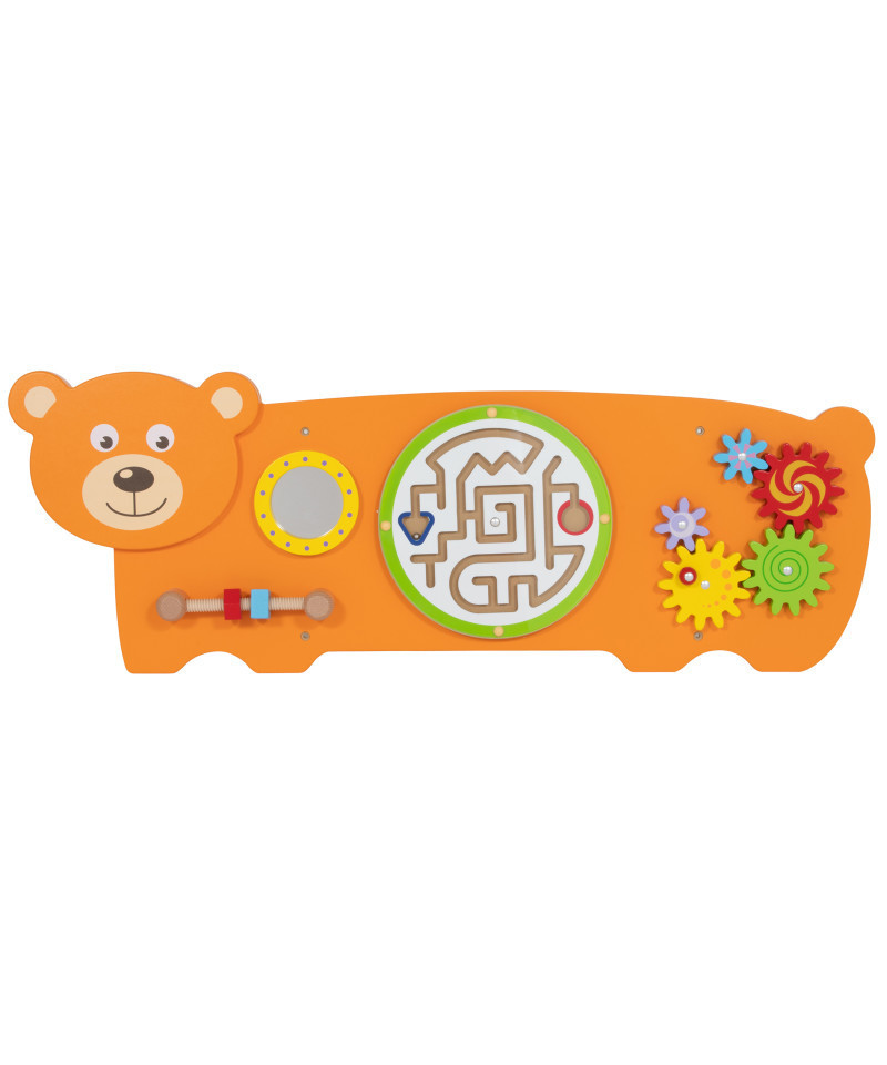 - TURN WALLS INTO A PLAYFUL FOREST -- This wooden bear wall panel features a threading shape twister, ball maze, mirror and five interconnected spinning gears.