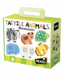 In addition to assembling 6 large 2-piece puzzles, children can exercise their sensory perception by searching for tactile cards, each of which corresponds to a different animal. Develop tactile sensitivity with the tactile textures. Great for making first discoveries with animals. Includes 6 animal puzzles, 6 touch cards, and small bag made of organic cotton.
