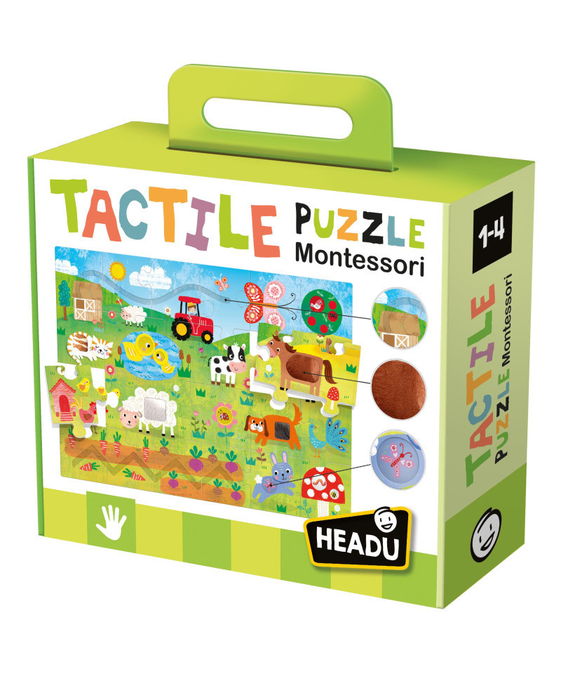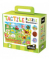 Farm puzzle with large pieces and lots of tactile areas to explore. Once they've completed the puzzle, children will enjoy touching the special textured tiles. Developing sense of touch with the tactile surfaces. Making first discoveries with farm animals. Includes one 19.5" x 27.5" puzzle with 21 large puzzle pieces and lots of tactile areas.