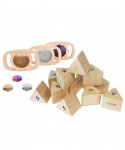 - 6 PERCUSSION TONES -- These blocks contain different contents, which produce different rattle-like sounds when the prisms are shaken. Children love to shake and listen to the woody sounds!