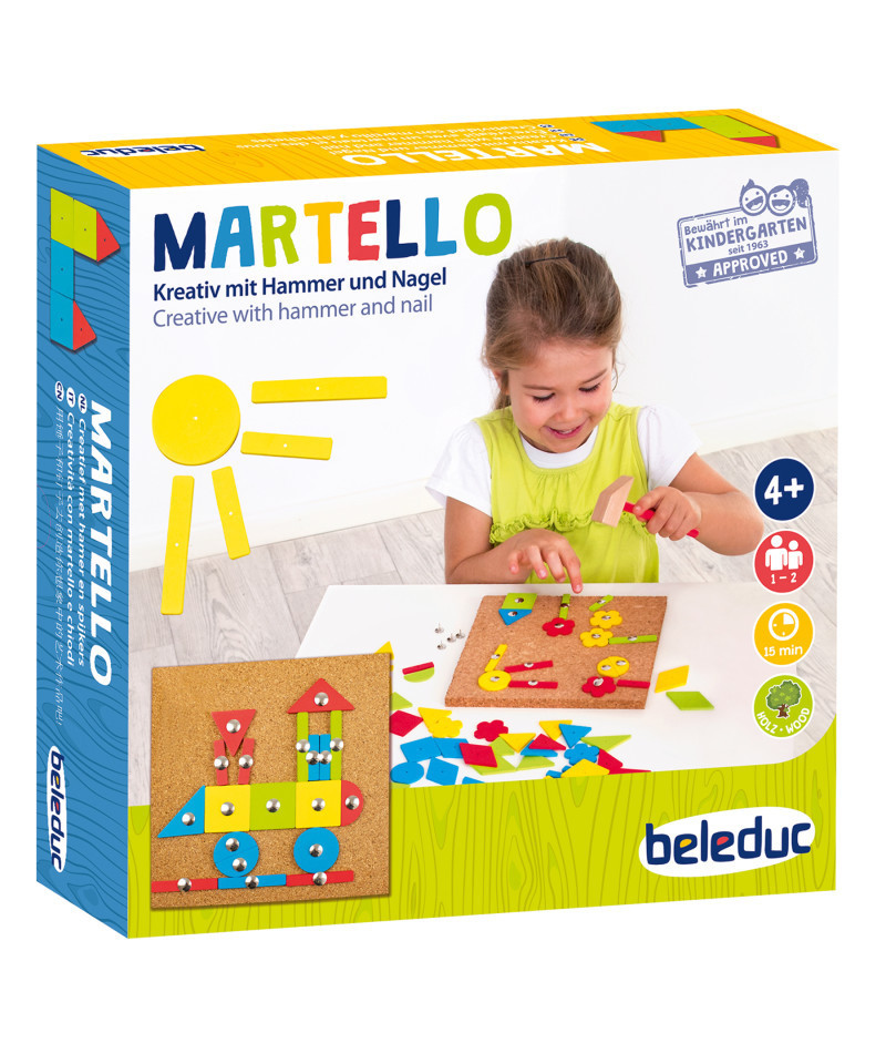 Use the wooden hammer and nails to affix the shapes to the cork plates. Removing all the pieces afterwards is just as easy. An instruction guide with colored examples is included to help very young children try to make their first pictures. Grab the hammer and the nails and let's go! Here you can place pictures on the cork boards. High-quality cork plate.