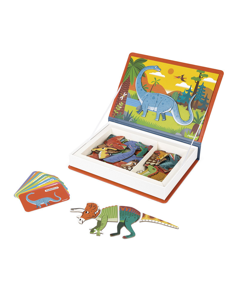 Have you discovered Magneti'books yet? These portable, educational magnetic books are loved by young and old alike! So, how do they work? This magnetic box includes a host of different magnetic items for kids to put together, according to the templates or any way they like! This cardboard game will transport children aged 3 and over to the realm of the dinosaurs with 40 magnetic pieces and 10 cards, each of which shows a dinosaur’s Latin name. Once the book is open, the aim is to put together a picture of the dinosaur shown on the card using the magnets provided. All the magnetic pieces are completely interchangeable, so kids can have hours of fun coming up with beasts even bigger and scarier than the real dinosaurs! Helps children develop their imagination and fine motor skills.
