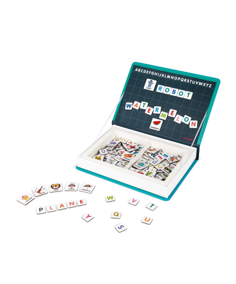 Magnetic educational game in cardboard to learn the alphabet in English. Composed of 26 illustrated magnets and 116 letters magnets. Once the book is opened, the aim is to write correctly on the stage the word indicated on the illustrated magnet.
