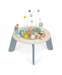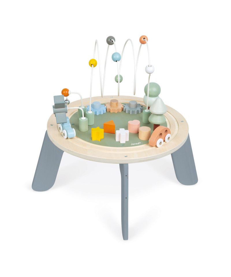 Here is the ideal toy to satisfy a toddlers' desires for discovery and manipulation! With this pretty wooden multi-activity table, baby will be delighted! Its size and the games offered make it perfectly suited to toddlers! This multi-activity table is a concentration of favorite activities: a circular train track with 2 vehicles that ring the bell, a small mill, 2 trees to stack, 3 loops with beads, 3 gears to rotate and 5 shapes to fit in.