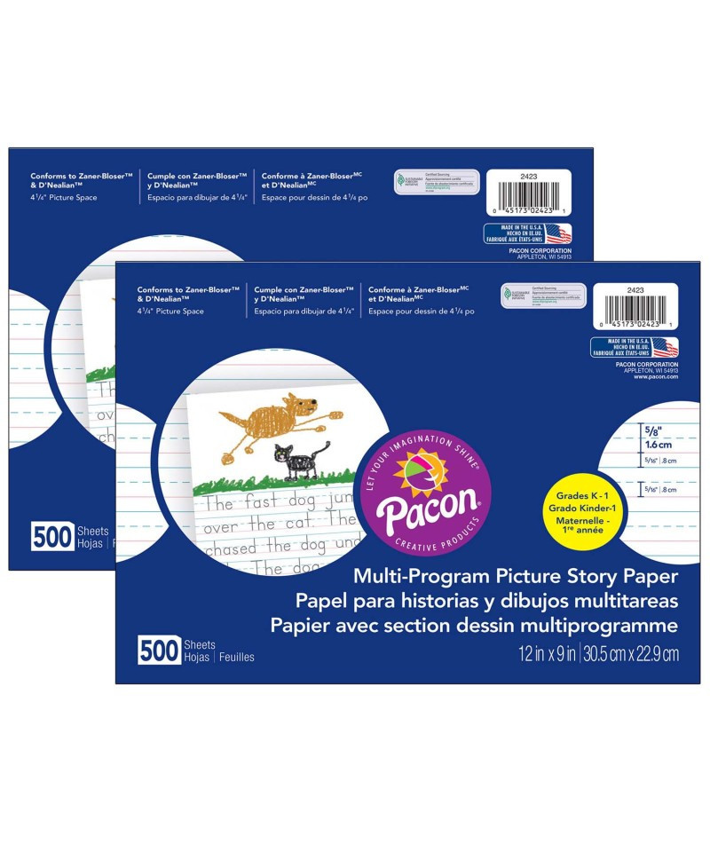 Our Multi-Program Handwriting Papers offer rulings that conform to both the Zaner-Bloser™ (Grade 1) and D'Nealian™ (Grade K) handwriting programs. Bright tablet paper ruled both sides with red baselines, blue dotted midlines and blue headlines. Great for tracking students' handwriting progress over time, and helps build a solid foundation for students to write legibly and communicate effectively through writing. 5/8" x 5/16" x 5/16" Ruled & 4-1/4" Picture Story Space. Recyclable. Measures 12" x 9". Each pack includes 500 sheets. Set of 2 packs, 1000 sheets total.