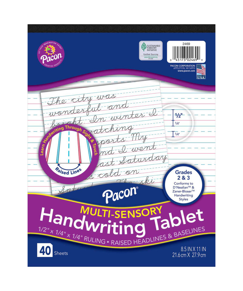 The Multi-Sensory Raised Ruled Tablet has raised headlines and baselines which help students stay within the guidelines. It helps teach handwriting through two senses: sight and touch. This portrait-oriented tablet mimics a standard notebook, making it a great option for students who benefit from the raised ruling, but may not want to draw attention to their learning difference. The headlines are blue and the baselines are red. It has a 1/2" ruling, 1/4" dotted midline and 1/4" skip space, and conforms to both D'Nealian™ and Zaner-Bloser™ handwriting styles. Tablet measures 8-1/2" x 11" and includes 40 sheets.