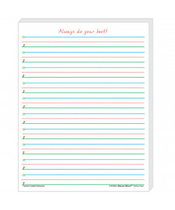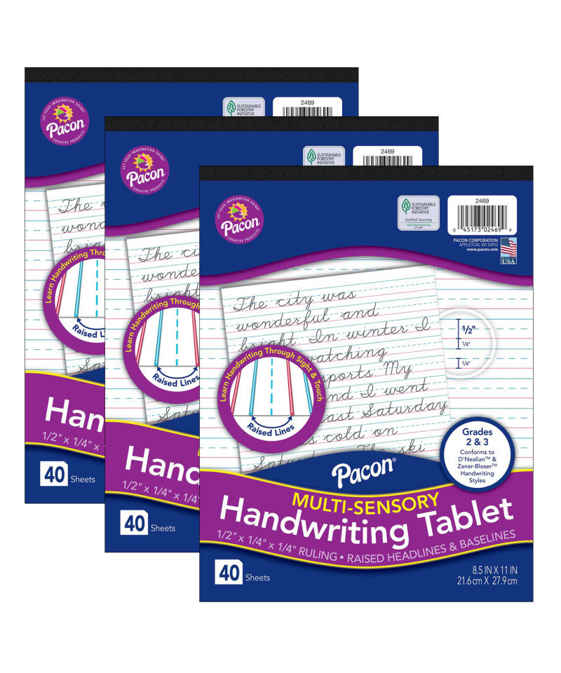 The Multi-Sensory Raised Ruled Tablet has raised headlines and baselines which help students stay within the guidelines. It helps teach handwriting through two senses: sight and touch. This portrait-oriented tablet mimics a standard notebook, making it a great option for students who benefit from the raised ruling, but may not want to draw attention to their learning difference. The headlines are blue and the baselines are red. It has a 1/2" ruling, 1/4" dotted midline and 1/4" skip space, and conforms to both D'Nealian™ and Zaner-Bloser™ handwriting styles. Tablet measures 8-1/2" x 11" and includes 40 sheets. Sold as a pack of 3 tablets.
