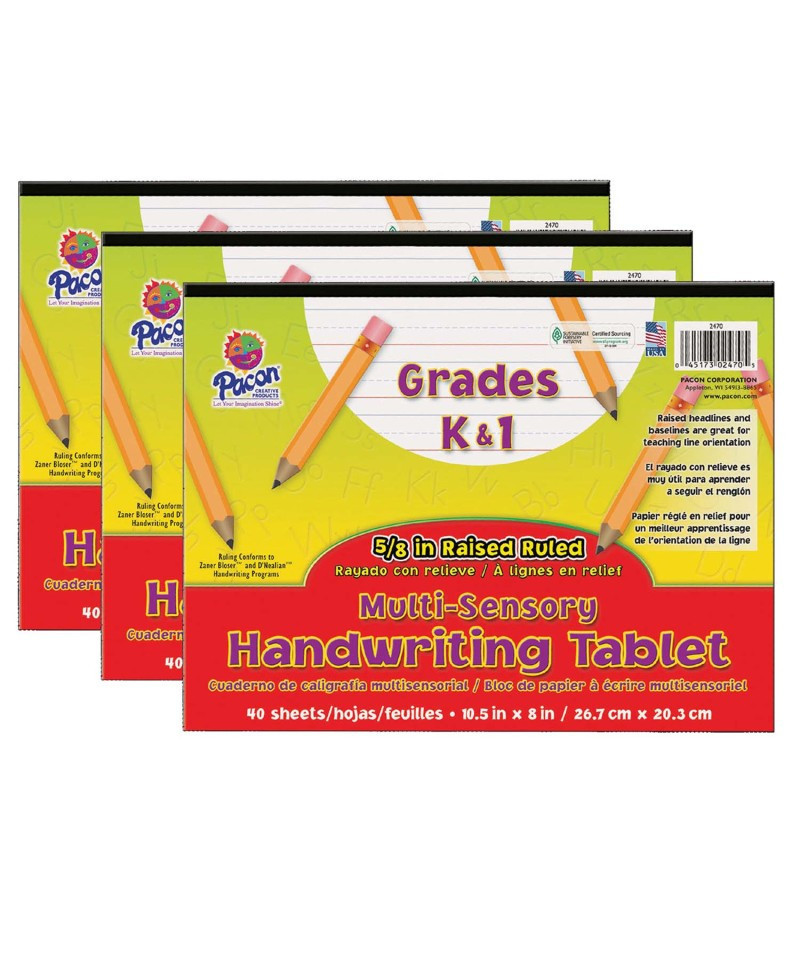 The Multi-Sensory Raised Ruled Paper has raised headlines and baselines which help students stay within the guidelines. It helps teach handwriting through two senses, sight and touch. The headlines are blue and the baselines are red. It has a 5/8" ruling, 5/16" dotted midline and 5/16" skip space and conforms to both D'Nealian® and Zaner-Bloser™ handwriting styles. Tablets contain 40 sheets with a heavy chipboard back and protective retail-friendly cover. Recommended for Grades K and 1. Measures 10 1/2" x 8". Pack of 3 tablets.