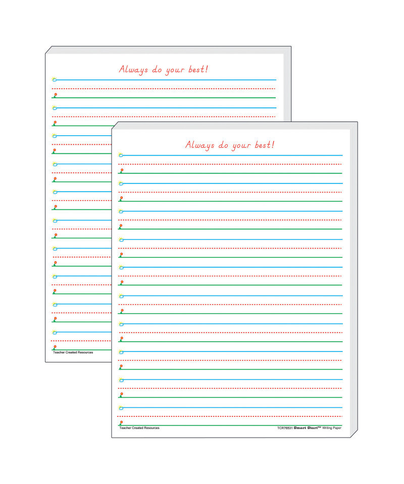 Smart Start Writing Paper (8-1/2" x 11") is truly a "Smart Start" for beginning and experienced writers. Bold graphics in blue, green, and red promote the feeling of success as children simply "Start at the Sky and pull down to the Ground" to form letters correctly. 1-2 Writing Paper lines have 5/8" spacing. Each pack includes 100 sheets. Sold as 2 packs for a total of 200 sheets.
