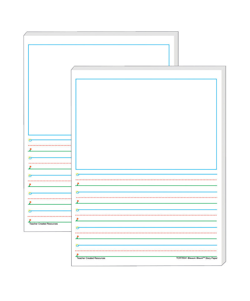 Smart Start Story Paper (8.5" x 11") is truly a "Smart Start" for beginning and experienced writers. Bold graphics in blue, green, and red promote the feeling of success as children simply "Start at the Sky and pull down to the Ground" to form letters correctly. 1-2 Story Paper has space for a picture and lines with 0.63" spacing. Package includes 100 sheets. Sold as a set of 2 packs, 200 sheets total.