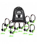 This pack includes 10 personal-sized Green (HA2-GRN), on-ear headphones – the ruggedly constructed, robust yet lightweight headphone – ideal for today's tech-filled classrooms or working and studying remotely. HA2 headphones not only provide rugged durability and high quality sound, but the lightweight, on-ear design allows for all-day comfort and easy compact storage.