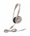 Lightweight stereo headphone features 3.5mm plug for children or adult. Two-layered cut-and-chew-resistant cord is permanently attached. Inline volume control on the 8 foot cord. Fully adjustable, lightweight headband. On-ear earcups with leatherette earpads.