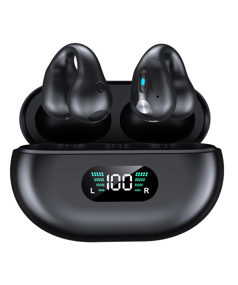 Experience next-level comfort and innovation with these Clip-On Wireless Earbuds, designed for a pain-free and secure listening experience. Unlike traditional in-ear headphones, these unique suspension-style earbuds clip gently onto your ears—no insertion needed—eliminating ear canal pressure, discomfort, and potential hearing damage. Perfect for running, workouts, and outdoor activities, the ergonomic ear hooks ensure a stable fit that won't slip, even during intense movement. Powered by advanced Bluetooth technology, these earbuds instantly auto-pair with your device for seamless connectivity and crystal-clear audio. Enjoy up to 18 hours of total playtime—5 hours on a single charge plus 2.5 extra recharges from the case, all easily monitored with the built-in digital display.