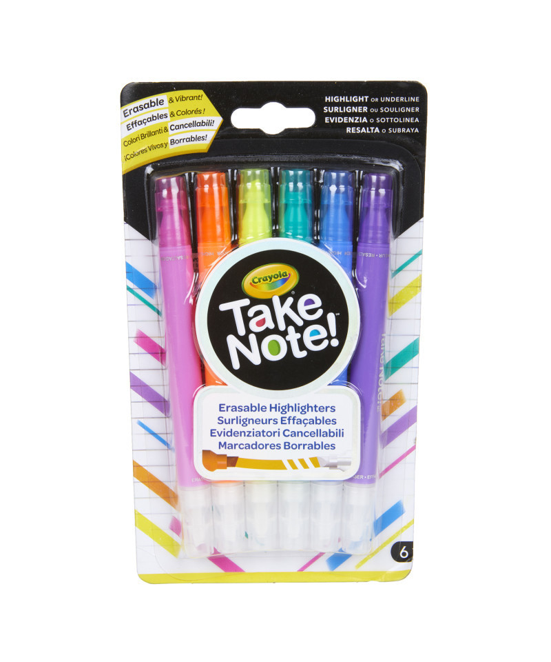 Highlight and erase in 6 vibrant colors—without damaging books or documents! The Crayola® Take Note! erasable highlighters have bright colors on one end, with clear ink tips on the other end for magically erasing the colorful highlights. No more worrying about highlighting the wrong word or over-highlighting a page! Includes 6 dual-tipped erasable highlighter markers in 6 different colors. For 6 years and up.