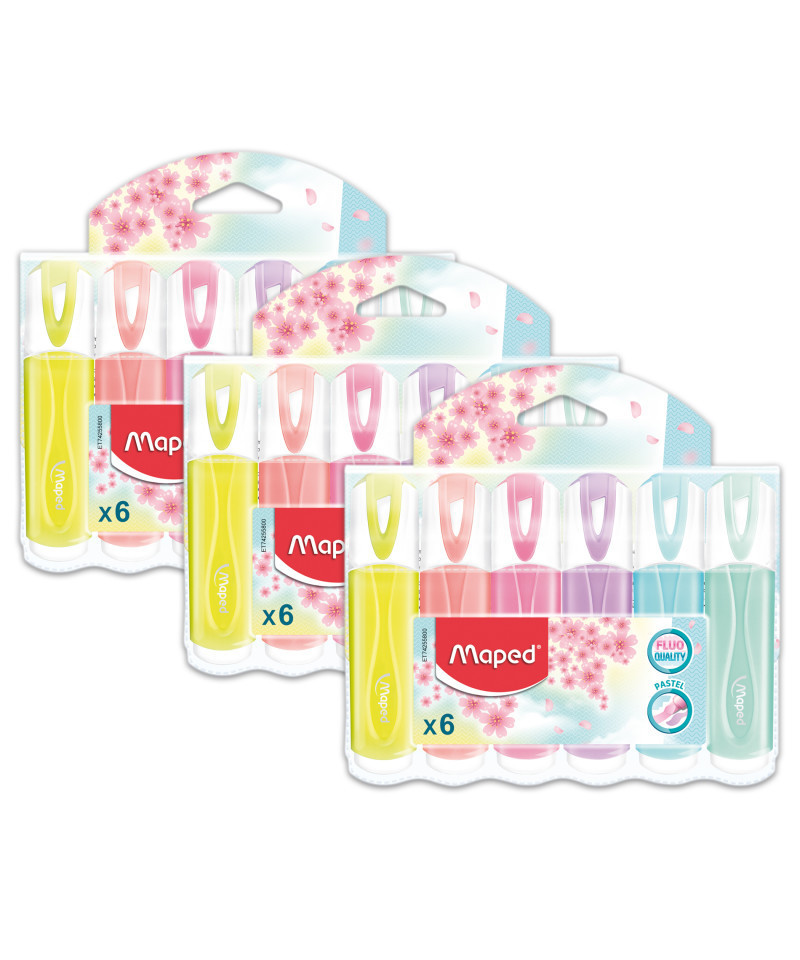 Fluo Pep Classic Pastel Highlighters are a fun new take on highlighters, perfect for school, home or office use! Their wide body fits comfortably in your hand and don't roll of your desk, and the super trendy Pastel ink really lets you show off your style! The soft, dual-beveled tip easily draws 5mm or 1mm lines depending on the side you hold the highlighter, and consistent ink dispensing make this highlighter the right tool for small or large jobs. Safe on all paper, inks, graphite, faxes, ink-jet printing and more! Each pack includes 6 unique Pastel colors (Blue, Green, Pink, Purple, Rose and Yellow) and come in a reusable storage case! Sold as 3 packs for a total of 18 highlighters.
