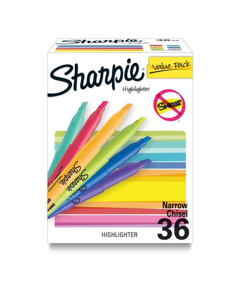 Perfect for when info is high priority and precision is a must, Sharpie Highlighters make everything highly visible with brilliant colors in transparent, smooth, and quick-drying ink. These versatile pocket highlighters are designed to fit effortlessly in your pocket or clip to your shirt for easy, on-the-go highlighting. The quick-drying ink resists smearing many pen or marker inks, while the versatile chisel tip highlights and underlines both wide and narrow lines of text. And with an array of brilliant colors, Sharpie highlighters make your most important thoughts and notes jump off the page. It's no wonder why Sharpie is the got-to-have highlighter for life's major high points. Each pack includes 36 highlighters.