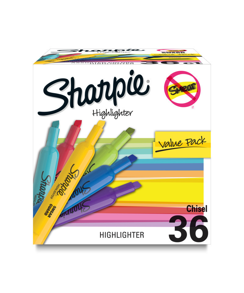 Perfect for when info is high priority and precision is a must, Sharpie Highlighters make everything highly visible with brilliant colors in transparent, smooth, and quick-drying ink. These wide-barreled tank highlighters feature a large ink supply for dependable and long-lasting use and an easy gliding chisel tip that highlights and underlines both wide and narrow lines of text. The quick-drying ink resists smearing many pen or marker inks. And with an array of brilliant colors, Sharpie highlighters make your most important thoughts and notes jump off the page. It's no wonder why Sharpie is the got-to-have highlighter for life's major high points. Each pack includes 36 highlighters.