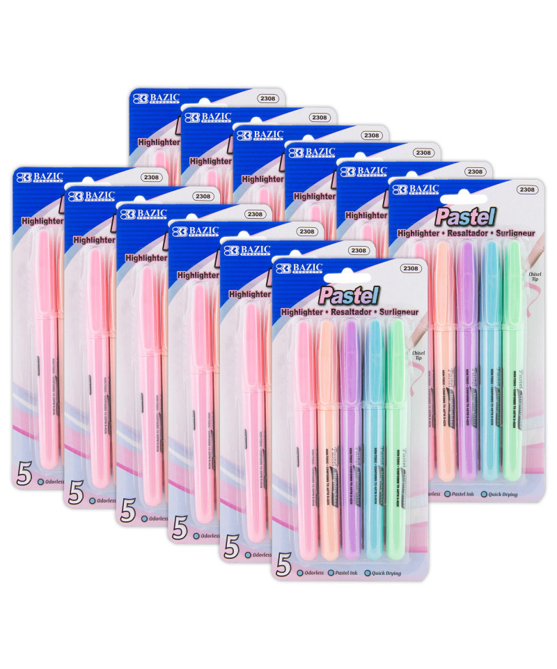 Pastel is in the style again, and these highlighters are just fresh out of the oven. They are pen style, can fit easily in any pencil pouches or pockets. The pen-style highlighter offers a narrow barrel and thin chisel tip for precise coverage of smaller text. Non-roll cap with pocket clip adds style and convenience. Each pack includes 5 highlighters. Sold as 12 packs for a total of 60 highlighters.