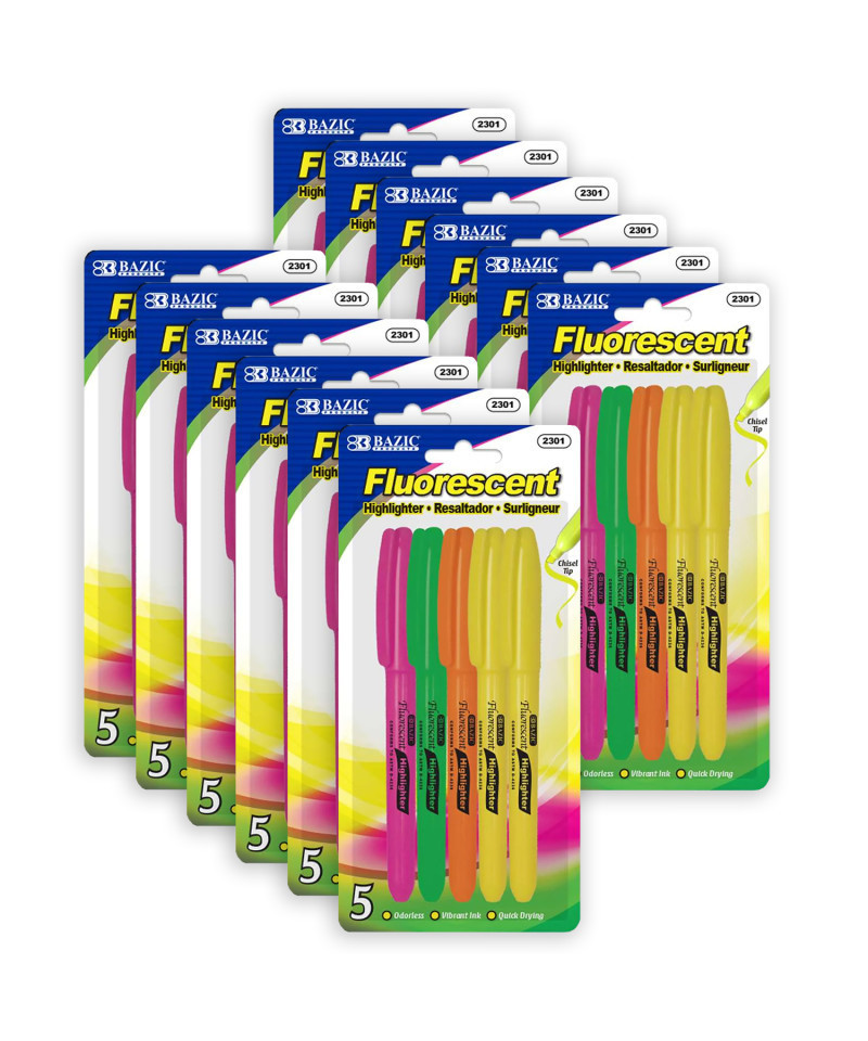 The pen-style highlighter features a narrow barrel and thin chisel tip for precise coverage of smaller text. The non-roll cap with pocket clip adds style and convenience. The highlighter has a molded narrow chisel tip that allows for two line widths: broad for highlighting and fine for underlining details with just a twist of the wrist. The vivid fluorescent ink provides maximum impact and instantly draws attention to key details and important information. The barrel color indicates the ink color. It dries quickly and doesn't bleed through most papers, including glossy and thin papers, smear and smudge-free. The durable tip lasts even after highlighting on rough surfaces. Ideal for college students, teachers, note-taking, working, studying, highlighting key points, underlining text, artistic sketching, coloring books, doodling, and more. Each pack includes 5 highlighters. Sold as 12 packs for a total of 60 highlighters.