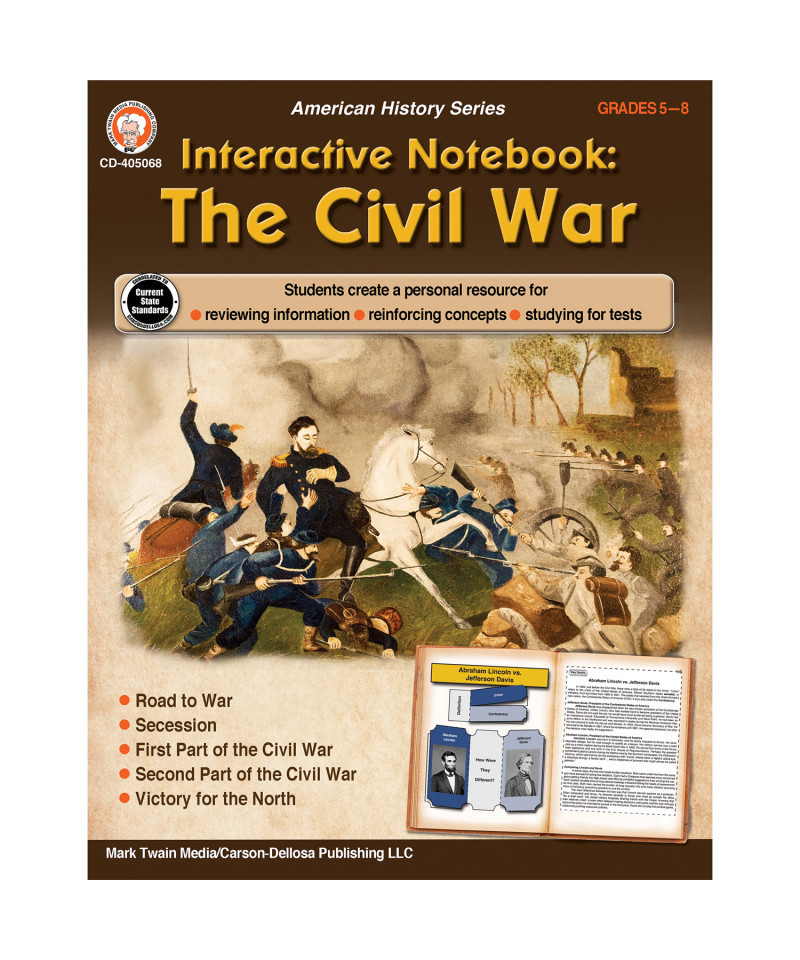 Mark Twain's Civil War Interactive Notebook helps 5th-8th graders create their own American history resource. Students strengthen their US history knowledge and creative and organizational skills through interactive learning. The 64-page American history book features multiple lessons and units of study focusing on the Civil War through interactive content. Students record, store, and organize essential information that is useful as a social studies reference guide for test prep. This standards-based notebook teaches US history through topics and lessons such as pre-war tensions, state secessions, important battles, and the North's path to victory. Students are encouraged to be creative, use color, and work with interactive content to gain a greater understanding of the topics covered, and become active participants in their own learning journey. Designed by leading educators, Mark Twain Media Publishing Company specializes in providing captivating, supplemental books and resources in a wide range of subjects for middle- and upper-grade classroom success.