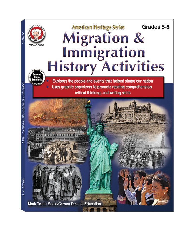 Help your 5th grader, middle school, or high school child build proficiency in US history with the activity-packed Mark Twain Migration & Immigration History Activities Workbook! The 64-page history workbook studies American history and culture in the United States, with topics including major migration and immigration events, coming to America, US citizenship, and more. Perfect for both classroom curriculum and homeschool curriculum, the 64-page social studies workbook includes both a Reading Selection, an Activity Page, and graphic organizers to promote reading, critical thinking, and writing skills. This American history workbook promotes current National and State Standards.