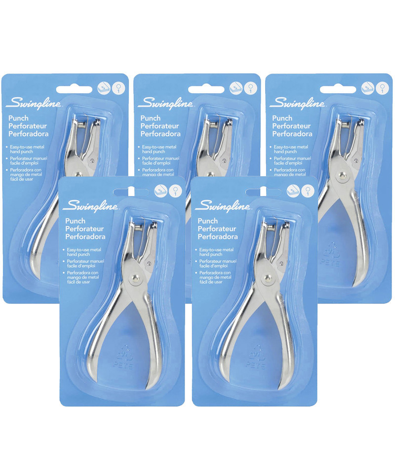 Single hole punch is useful at home, school or work and is great for traveling. Metal, handheld single hole punch, features a 5 sheet paper punch capacity, and creates a 1/4" hole. Paper chip holder makes clean-up fast and easy. Sold as a pack of 5 punches.