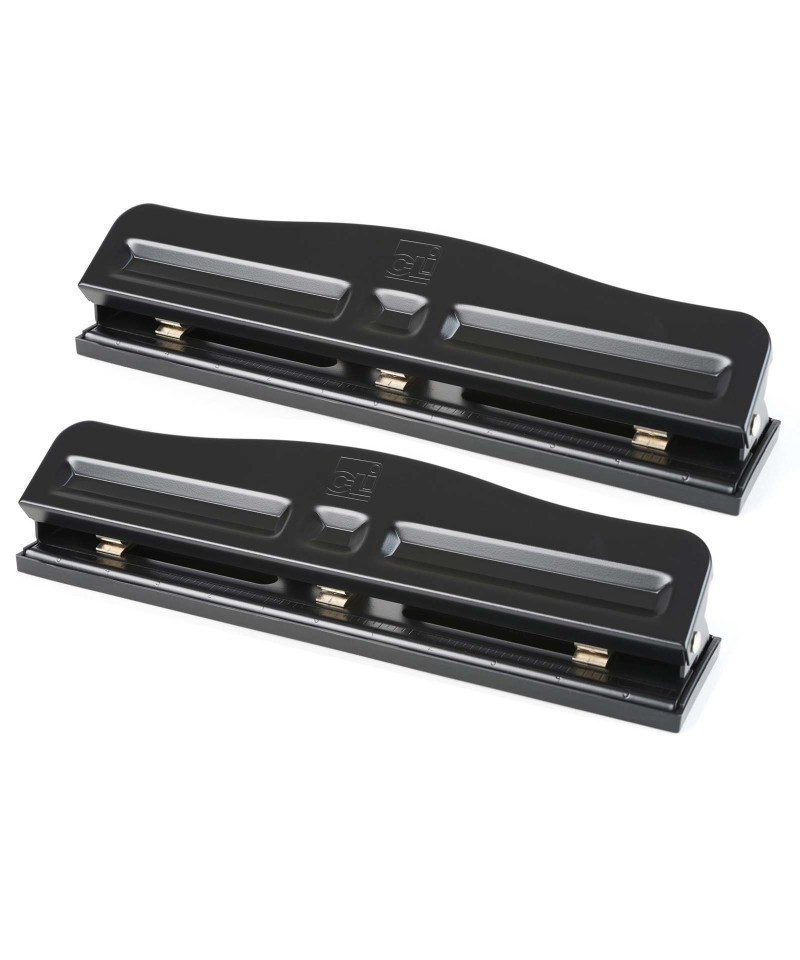 The three-hole adjustable paper punch features black enamel finish, non-skid base, removable chip trap and accurate built-in centering guides. Fully adjustable and converts to a two-hole punch with built-in neutralizing center head. Punches up to 12 sheets of 16 lb. paper. 0.28" hole Diameter. Sold as a pack of 2 paper punches.