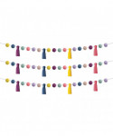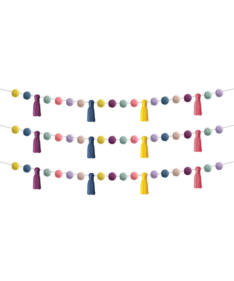 Instantly brighten any space with this pom-poms and tassels garland. This fun and festive garland will add the perfect splash of color to your home or classroom, or use it to celebrate any special occasion. Pom-poms are approximately 1-1/2" in diameter. Tassels are approximately 5" in length. Each garland measures 60 inches in length. Sold as a pack of 3 garlands.