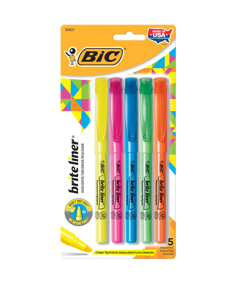 Whether you're organizing your notes or underlining passages in a textbook, BIC Brite Liner Highlighters make highlighting fun and easy. These highlighters come in five highly visible, fluorescent colors, allowing you to easily color-code and emphasize information. Each highlighter has a versatile, firm chisel tip that allows you to seamlessly switch between broad highlighting and precise underlining. BIC Brite Liner Highlighters can be left uncapped for up to eight hours without drying out. And thanks to their convenient pen-shaped design, these highlighters are easy to grip and use. Each pack includes 5 highlighters.