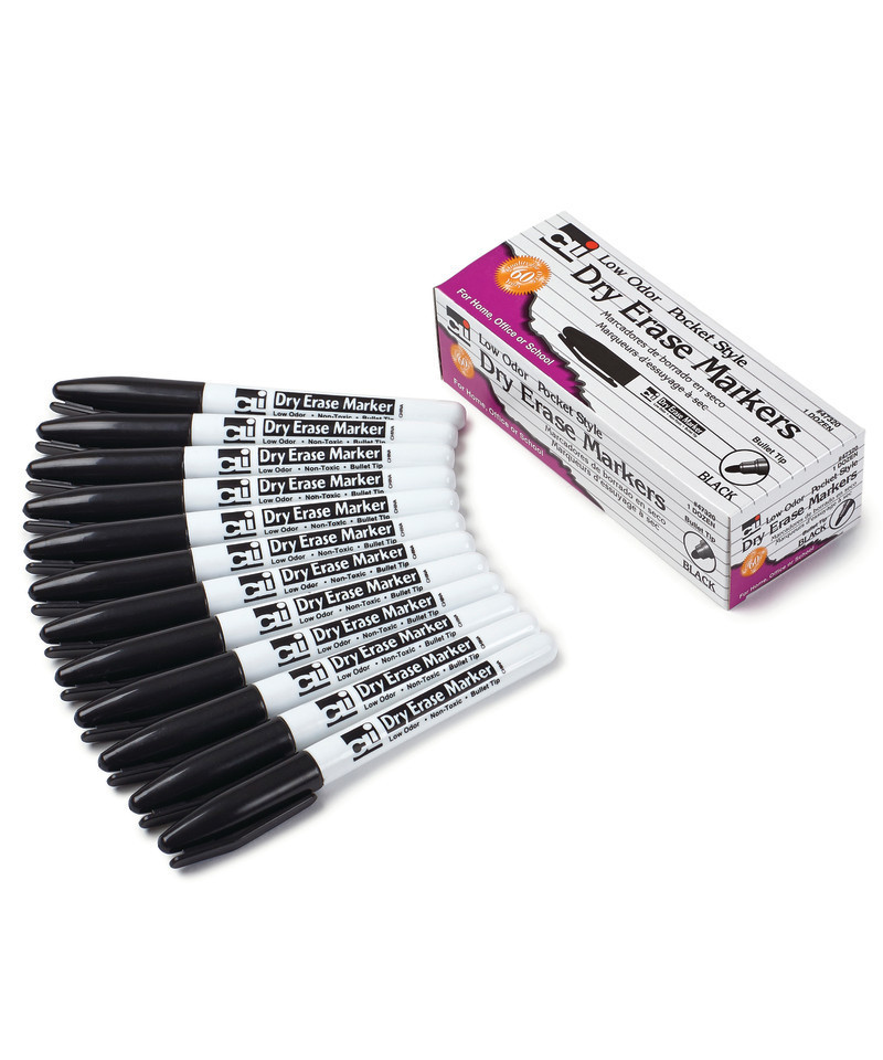 These dry erase markers are low odor but feature bold, bright vivid colors. Making sure that all your work can be seen, whether you are at the back of the class or boardroom! These dry erase markers can be used on dry erase boards, glass or any other dry erase surface. Markings will wipe away cleanly and easily using either a dry erase eraser or cloth. These pocket style markers have bullet tips and are AP Certified, NON-Toxic, conforming to all ASTM D-4236 standards. Box contains 12 black dry erase markers.