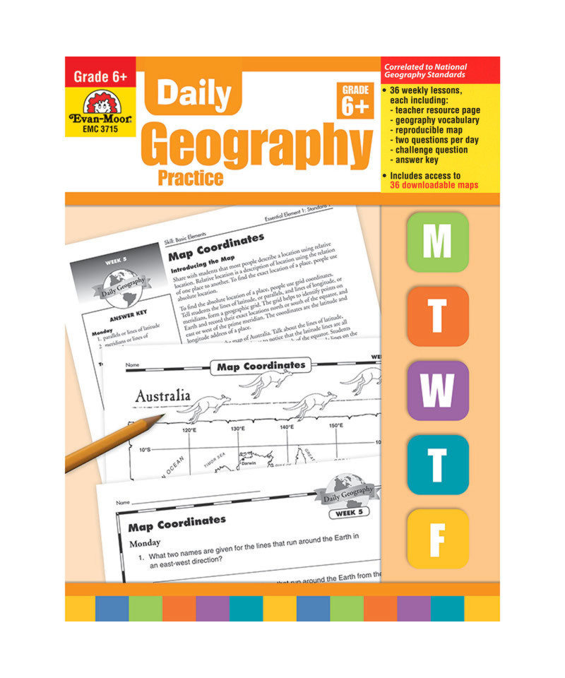 - In Daily Geography Practice, Grade 6+, 36 map lessons introduce basic geography skills and over 130 geography terms