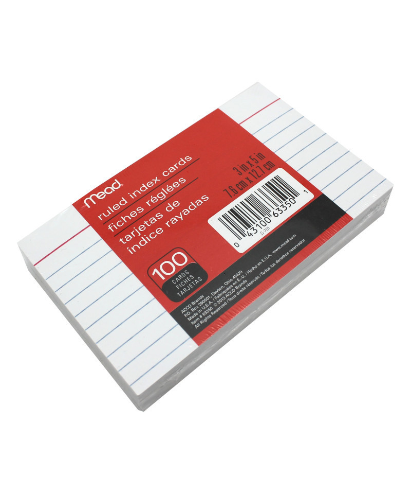 Perfect for both students and professionals these 3" x 5" index cards can help you learn, remember and communicate. Ten, ruled lines on each index card help guide your writing so the notes you create are perfectly aligned, no matter how much or how little you write on each card. The spaces between each line are also large enough so that you can write at normal size and easily read your notes with a quick glance. Index cards are extremely versatile and can be used for virtually any need in class, at the office or on the go. Smaller and more convenient than a notebook, ruled index cards always come in handy. Keep a stack in your backpack, purse, briefcase, or even in your pocket. Each pack includes 100 white cards.