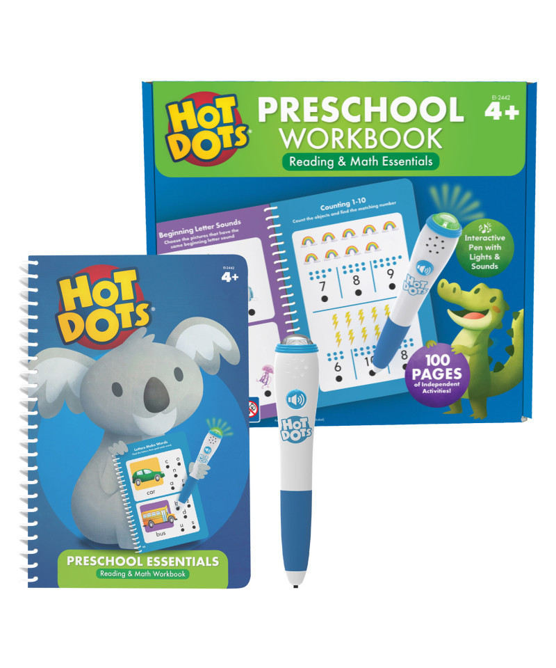 Independent learning really hits the spot with the Hot Dots Preschool Workbook, packed with reading and math essentials! Designed specifically for preschoolers by educational experts, this set features an interactive, electronic Hot Dots pen with light and sounds effects (and a mute button for quiet learning) and 100 pages of standards-based, foundational preschool reading and math activities. Kids review colorful, illustrated questions, then press the pen to any answer dot for instant, confidence-boosting feedback. And they can do it on their own! Kids can develop key skills, including letter recognition, letter sounds, counting, numbers, and more, anywhere, anytime with this portable, self-paced, independent learning set. Hot Dots Pen requires 2 AAA batteries, not included.