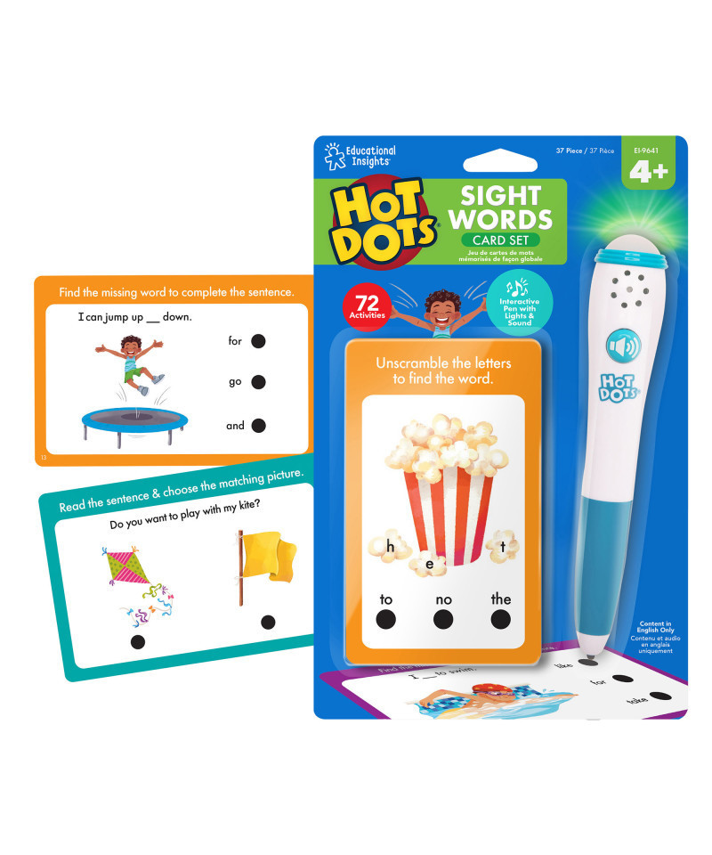 Build reading fluency and learn beginning sight words with hands-on, independent activities that let kids learn at their own pace. Set includes 36 double-sided cards (72 self-paced activities) and interactive Hot Dots pen.