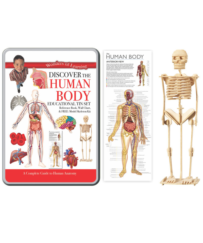 This Human Body tin set contains a detailed 32 page reference book, an educational wall chart, and a skeleton model kit. Fun ways to discover and explore the world around us!