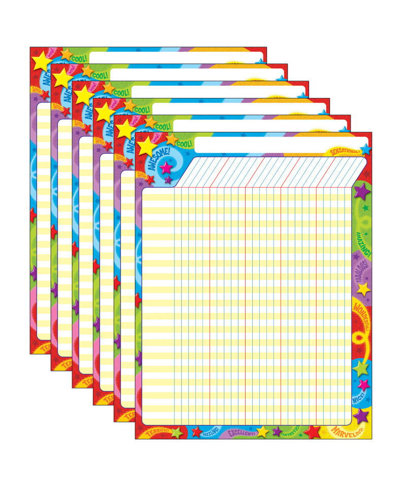 Spark excitement for setting goals, tracking progress, celebrating success. Great for schools, homes, and offices. Add stickers to add fun! Each chart measures 17" x 22". Charts feature 36 rows and 25 columns, enough room for the entire class. Sturdy and durable. Coordinate with a variety of TREND products. Ideas, activities, and reproducibles on back. Sold as a pack of 6 incentive charts.