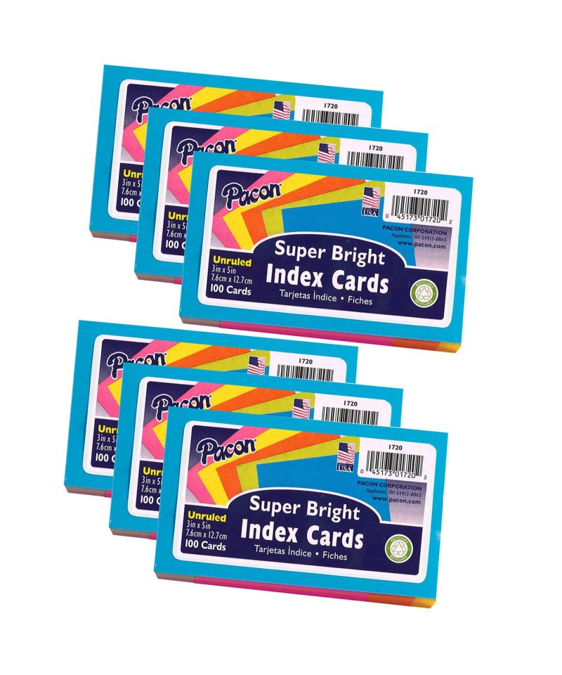 Organize notes, files, project lists and contact information with index cards. Sturdy tagboard. Super Bright assorted 5 colors: Hot Pink, Hot Yellow, Hot Blue, Hot Orange and Hot Lime. Recyclable. Unruled. Measures 3" x 5". Each pack includes 100 index card. Sold as a set of 6 packs, 600 index cards total.