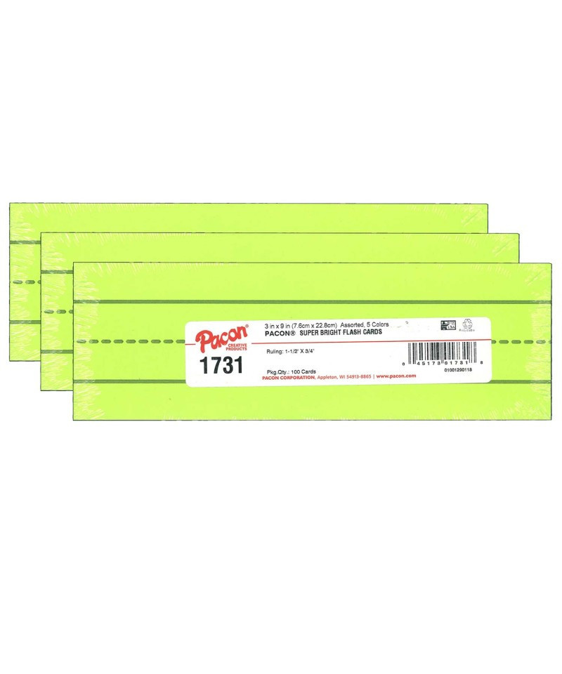 Sturdy tagboard stock has 1-1/2" ruling with 3/4" dotted midline on one side and a single line ruled on the opposite side. Assorted colors include: Hot Pink, Hot Orange, Hot Yellow, Hot Lime and Hot Blue. Packages are film wrapped. Recyclable. Measures 3" x 9". Each pack includes 100 flash cards. Sold as 3 packs for a total of 300 flash cards.