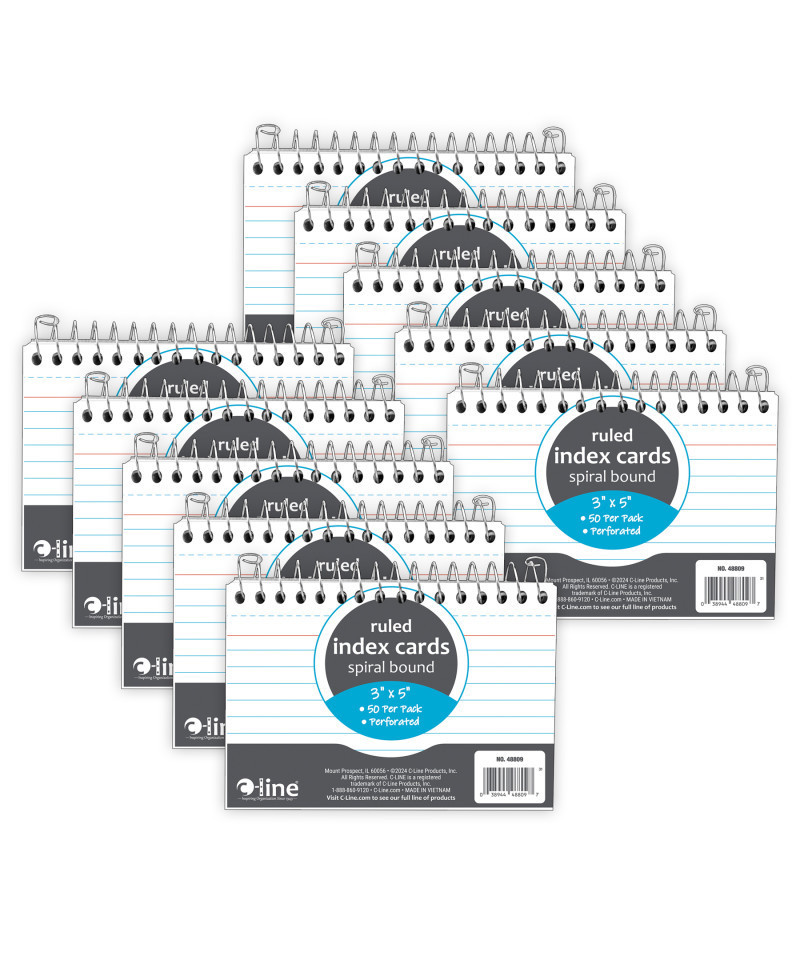 Keep your notes and lists organized in one convenient, portable notebook. A must have for Back-to-School. Cards are lined on the front, blank on the back, and perforated for easy removal. This index card notebook is great for flash cards, recipes, to-do lists and more! Perfect for home, school, and business. Each notebook includes 50 cards. Sold as a pack of 10 index card notebooks.