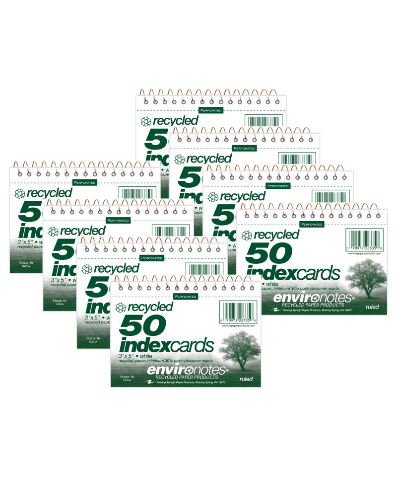 Wirebound Index Cards measure 5" x 3.5". Cards are produced with a minimum 30% PCW. Each card is ruled on one side and perforated for easy removal. Cards tear out to 5″ x 3″. There are 50 cards per book. Wire ends are coil-locked for snag-proof performance. Sold as a pack of 8 books.